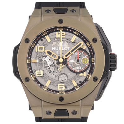 ウブロ独自開発のマジックゴールド(傷のつかない金素材)や軽量カーボン・ブラックセラミックは、素材の特殊性から高い評価を受けます。素材の傷・欠けがない状態良品は特に需要があります。